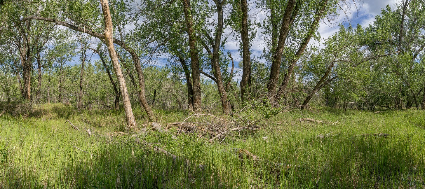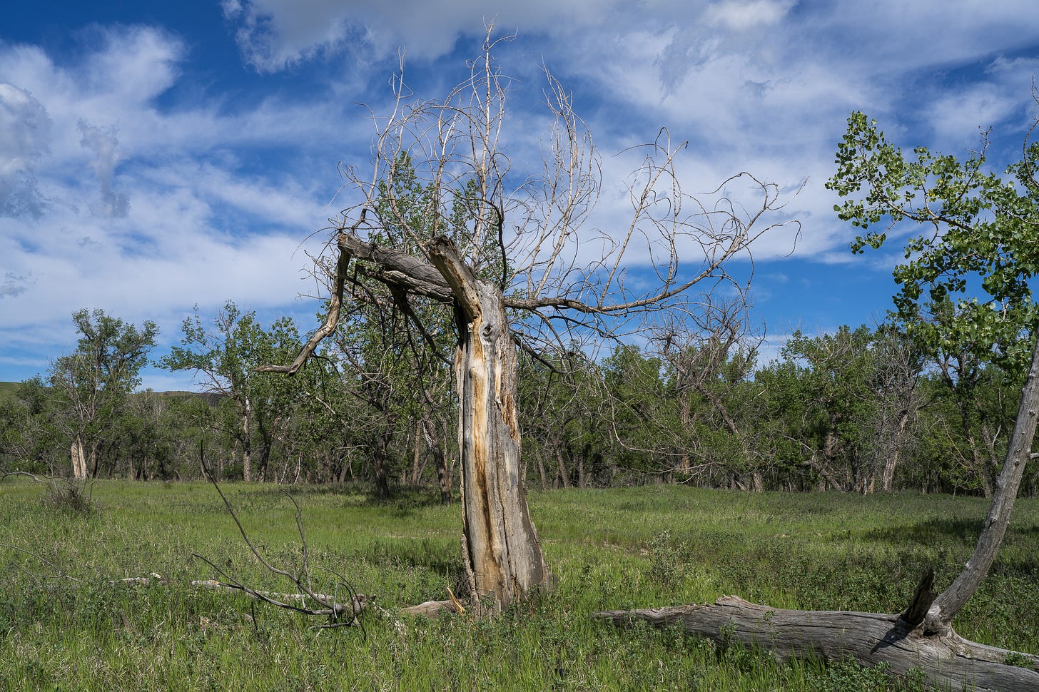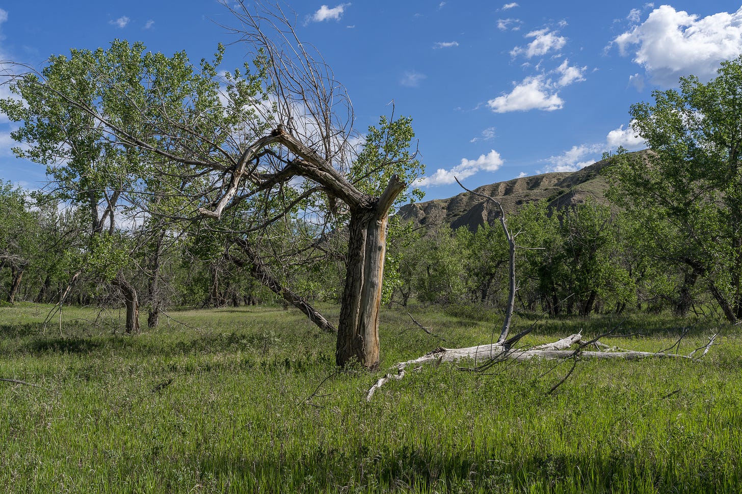 Cottonwoods, more than any tree I know, cut across the sky and spread out like a million tiny rivers. Very early in their lives, they stand majestically in one place but sooner than most trees they fall down of their own accord in what looks to be despair. Today they are less than useful, all you can do with them is make paper pulp and other products calling for pulp. They do not make useful tables, chairs or telephone polls. Yet my eye is always pulled toward them. In their small groups, usually following a river or culvert, they remind me of a battlefield with the wounded lying about everywhere, randomly scattered. But visually, they are just hard to ignore.