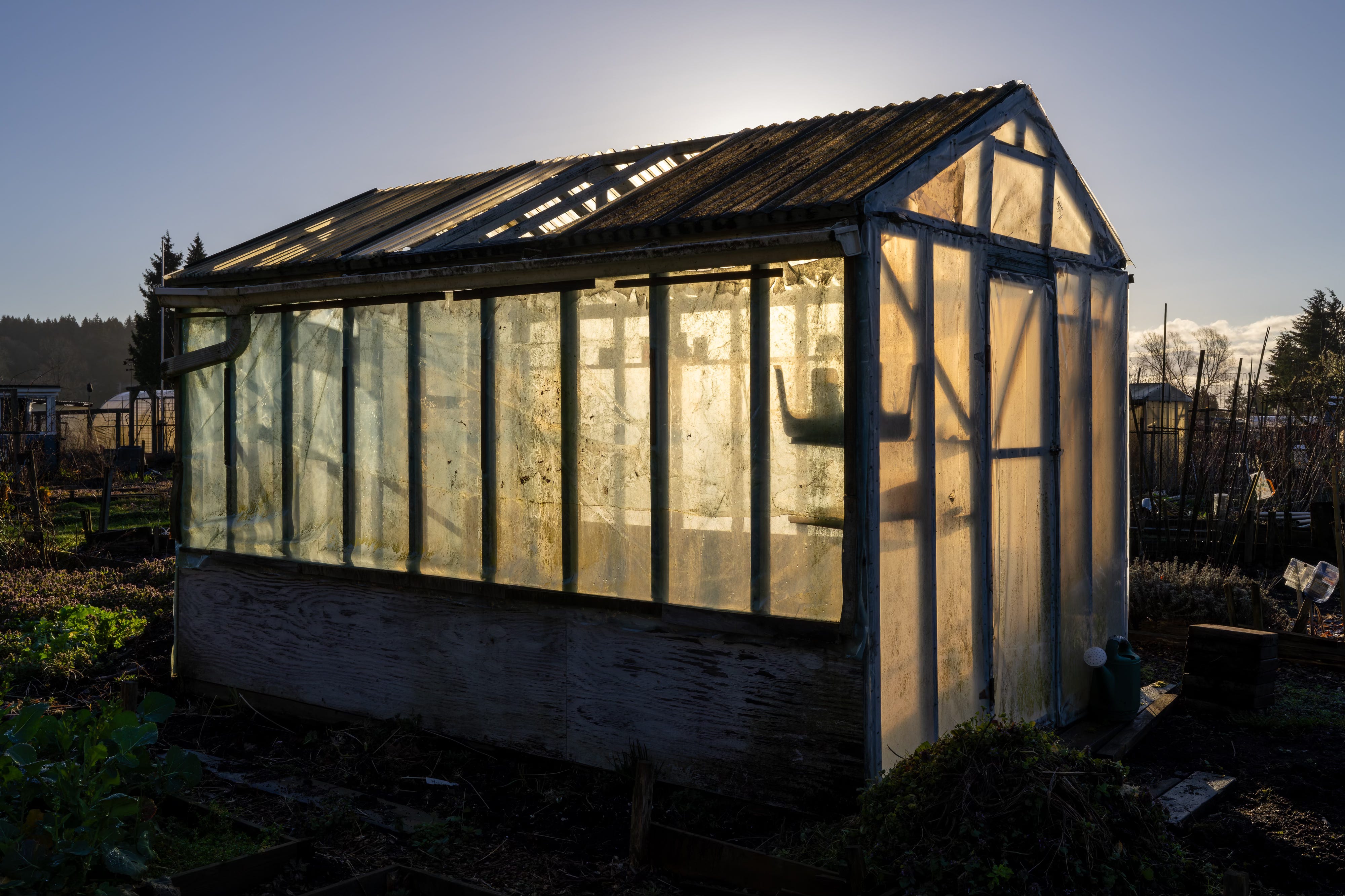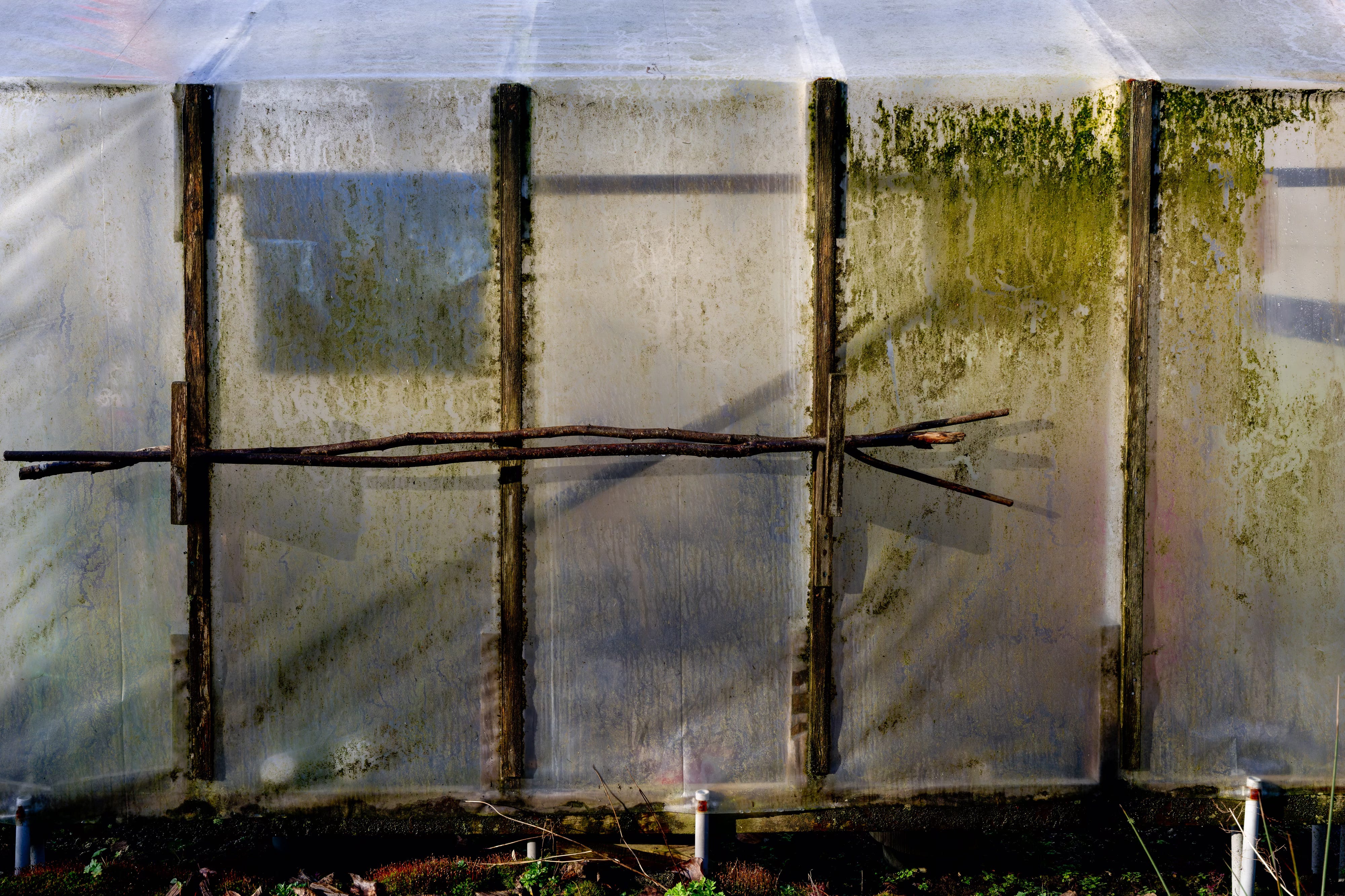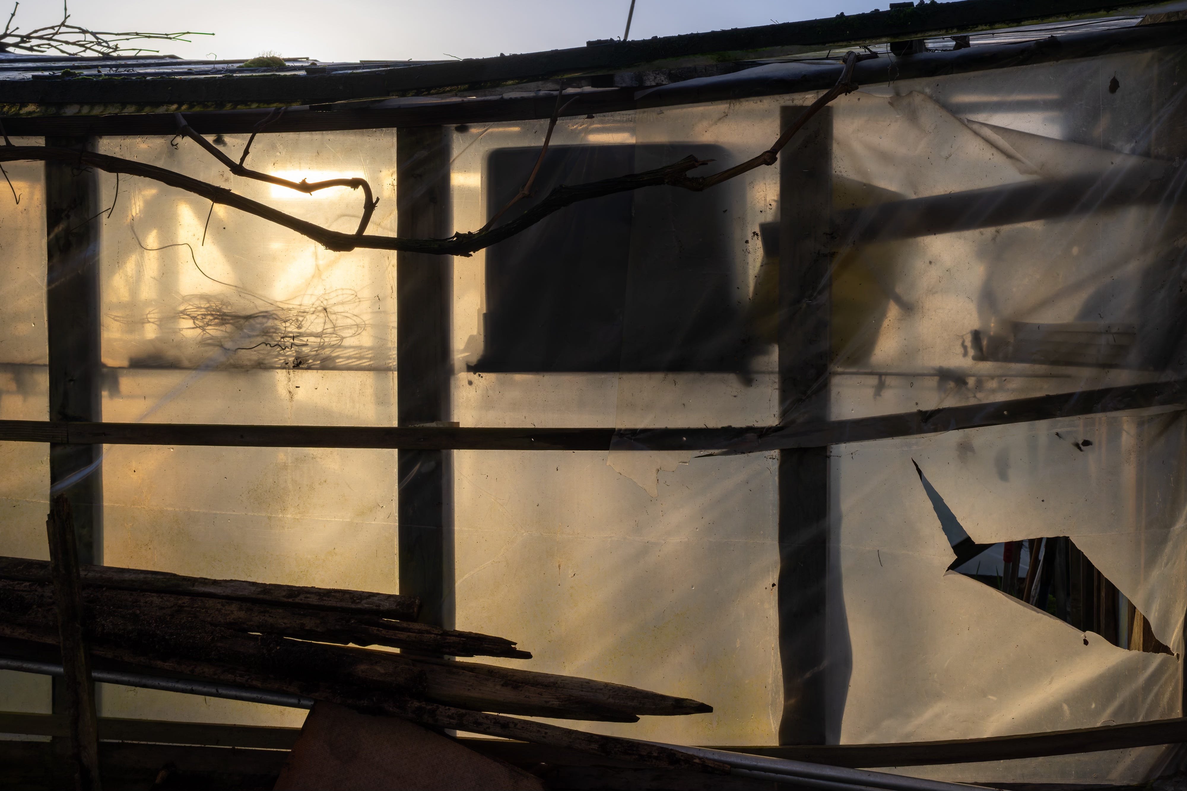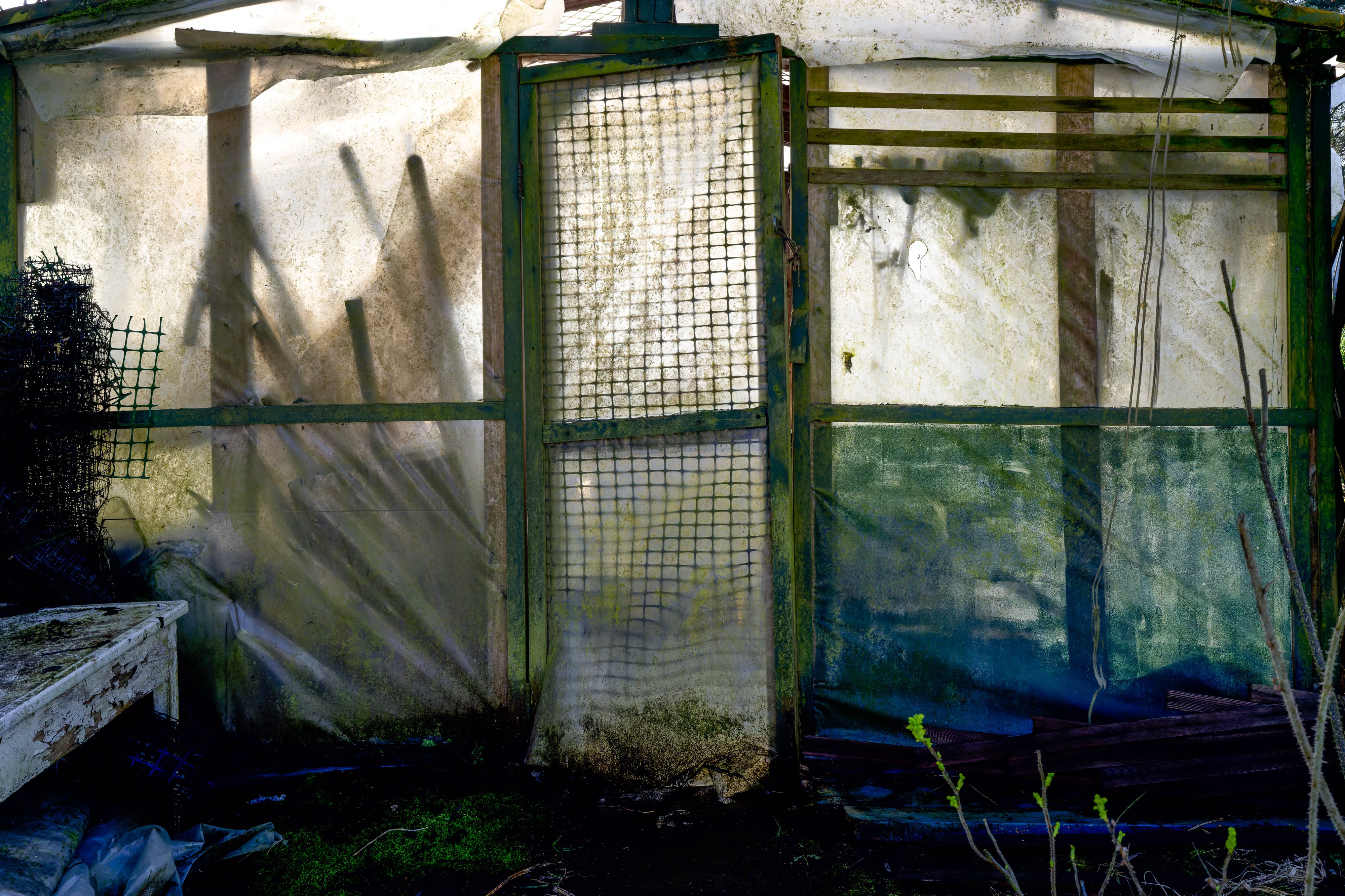 What interested me was the way the early light passed through the greenhouse walls. These buildings are meant to be transparent, but months of rain had changed them. Moss, condensation, and the slow trails of snails and slugs had thickened the plastic. Instead of looking through the walls, I found myself looking at them.