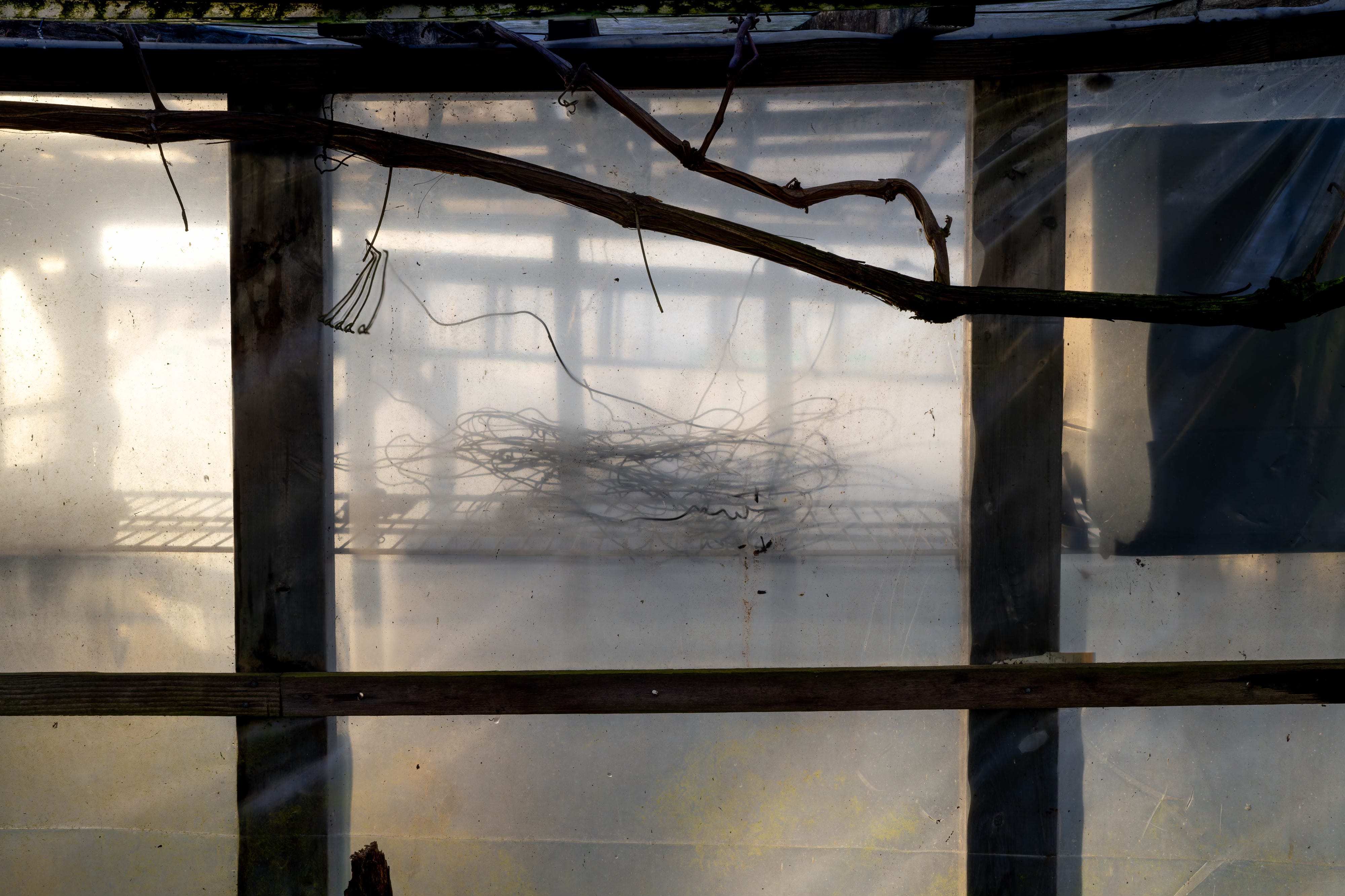 These greenhouse walls had begun to behave almost like accidental shoji screens. Light passed through them, but imperfectly. The surfaces withheld as much as they revealed.