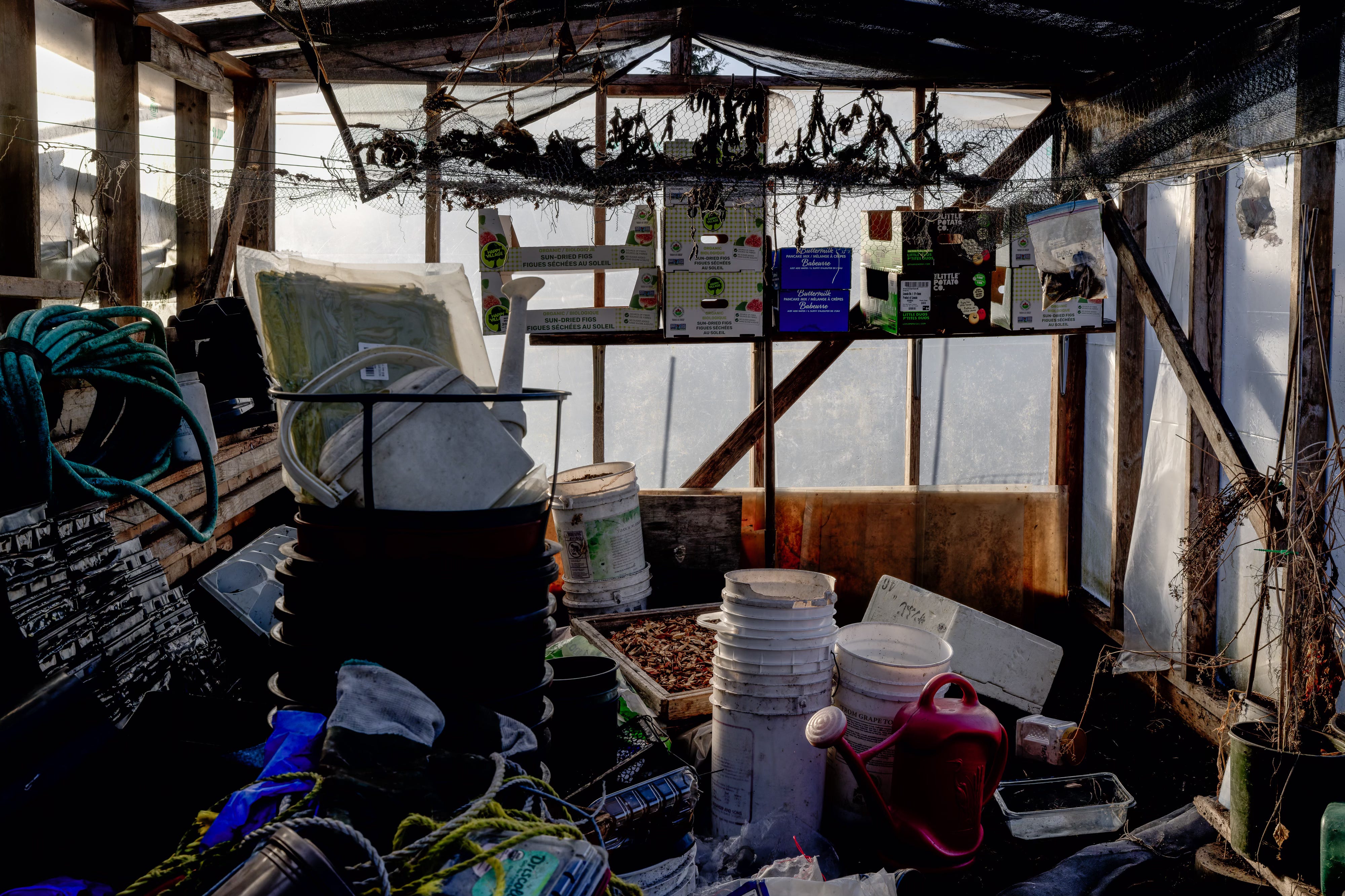 For a brief moment in late winter, the buildings exist in this state. In a few weeks, the walls will be cleaned and the beds prepared for spring planting. Much of the moss will disappear, and the plastic will become transparent again. But that morning, the surfaces were still heavy with the season that had just passed.