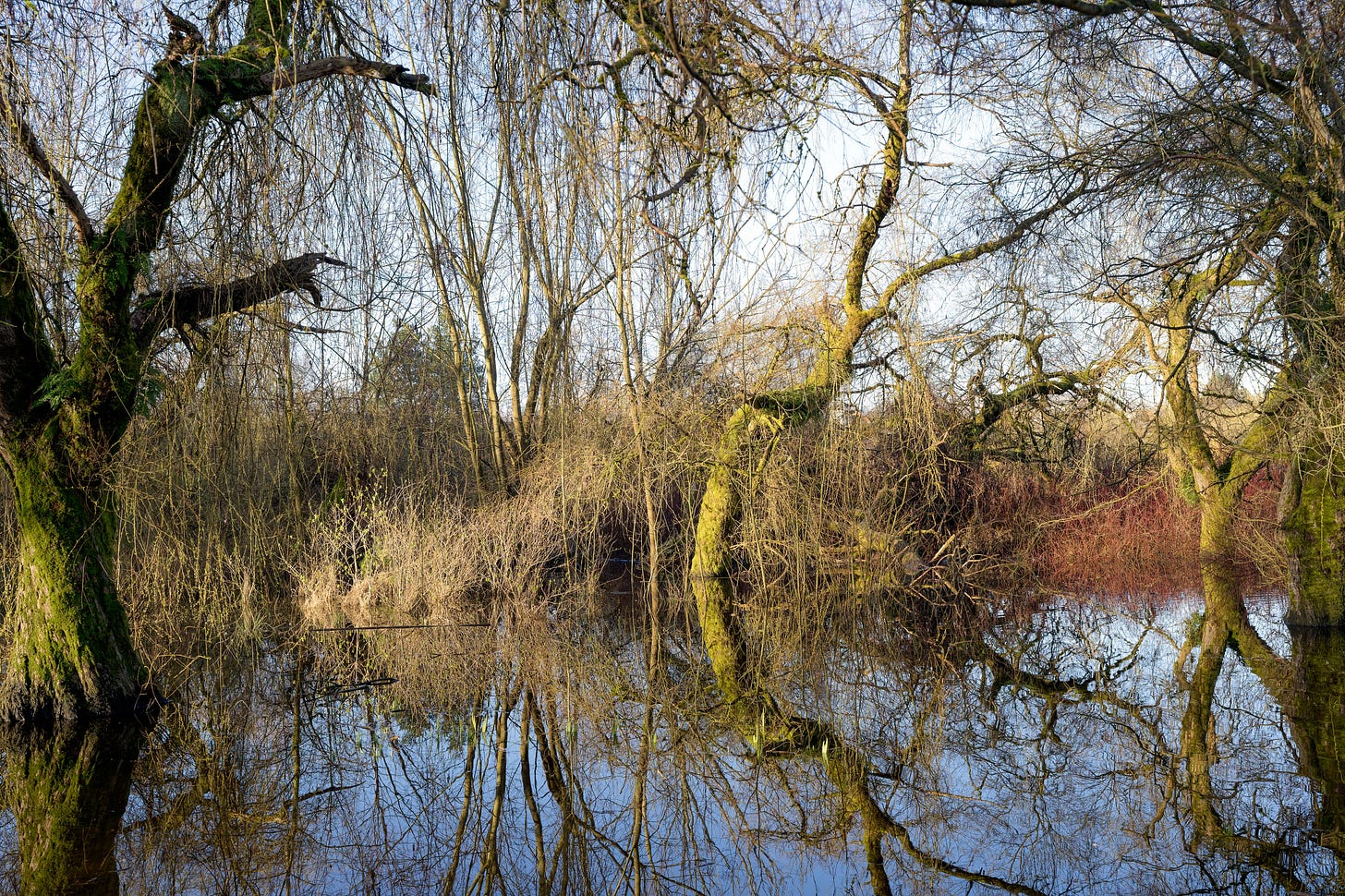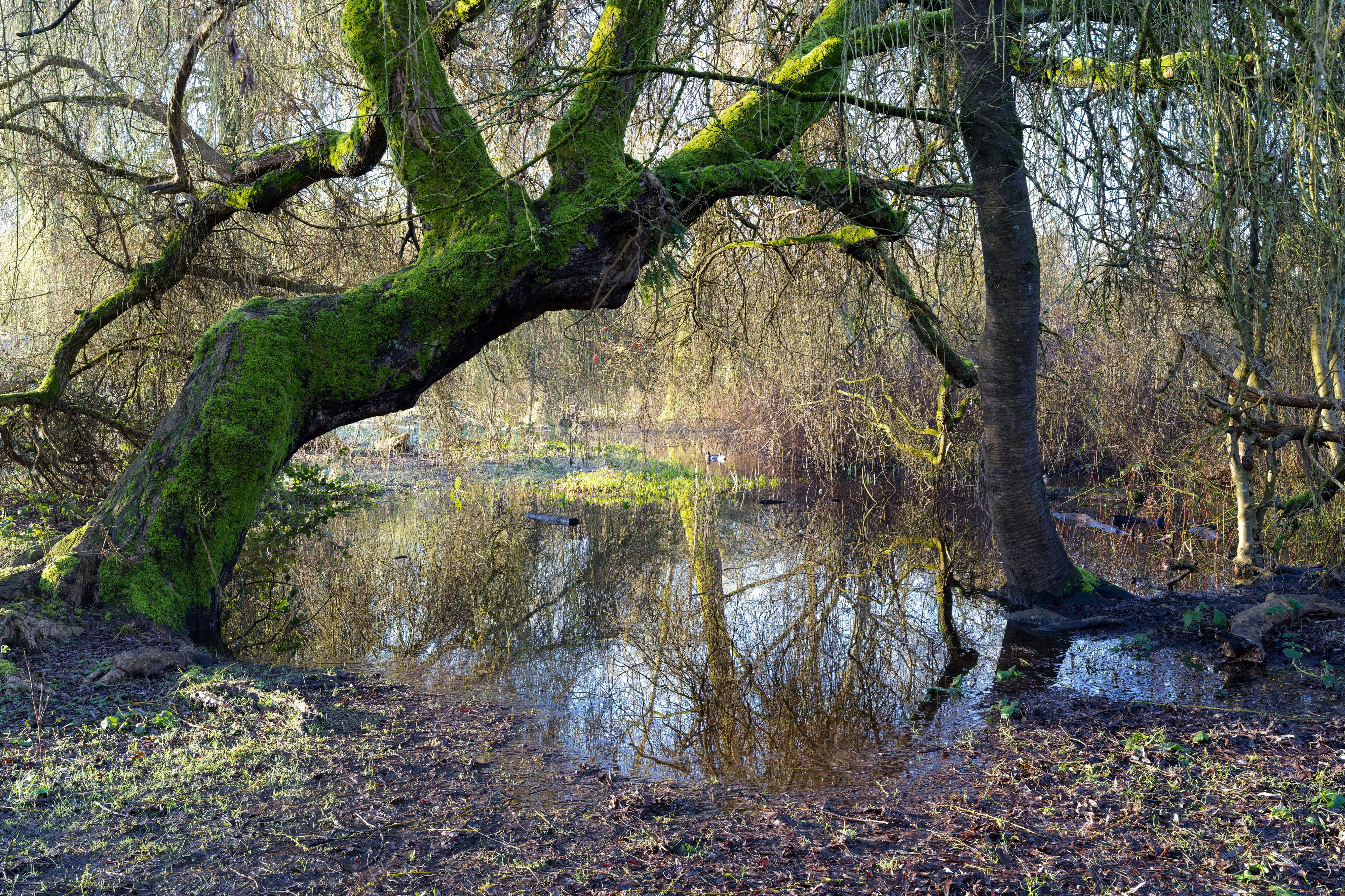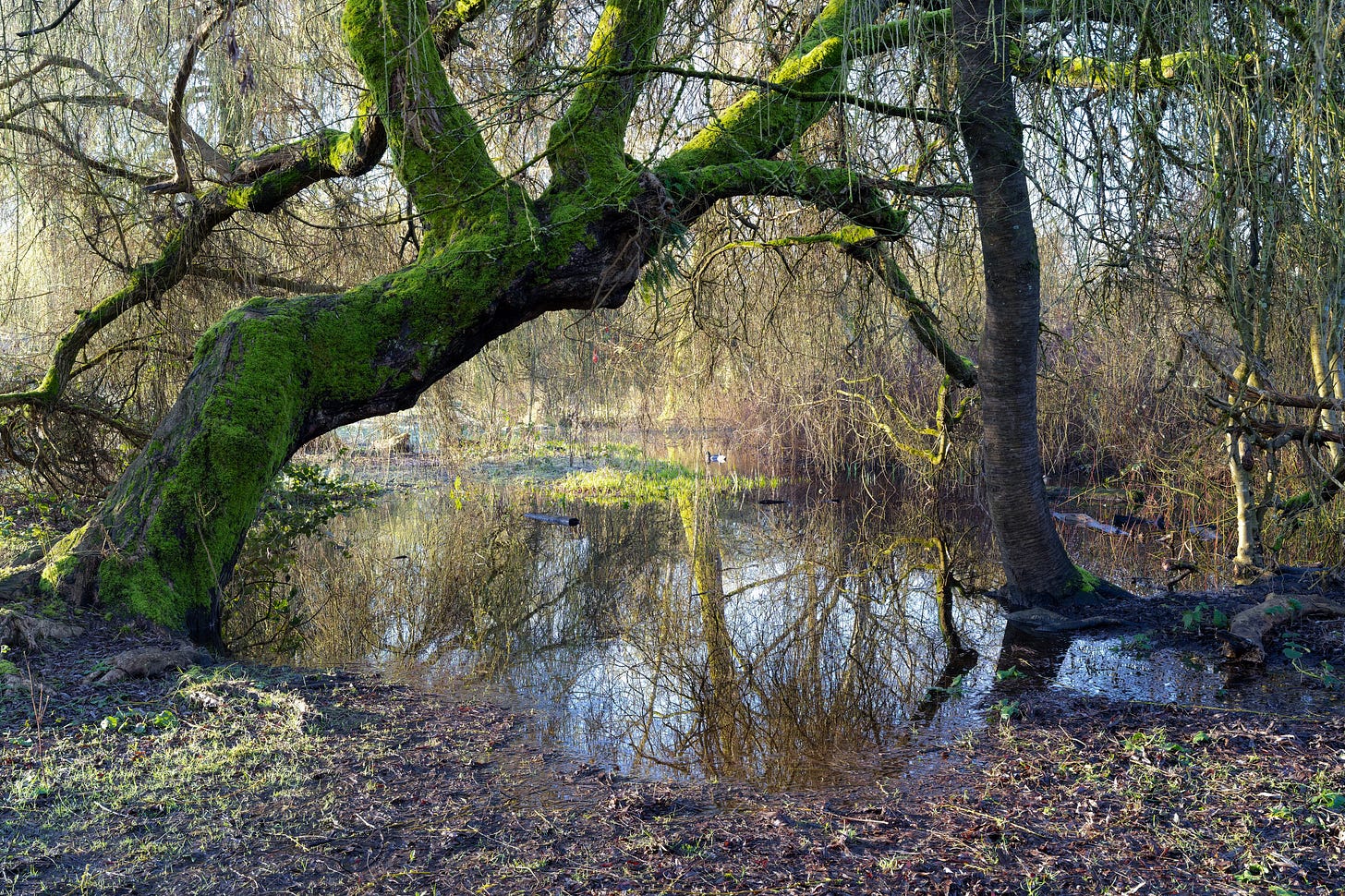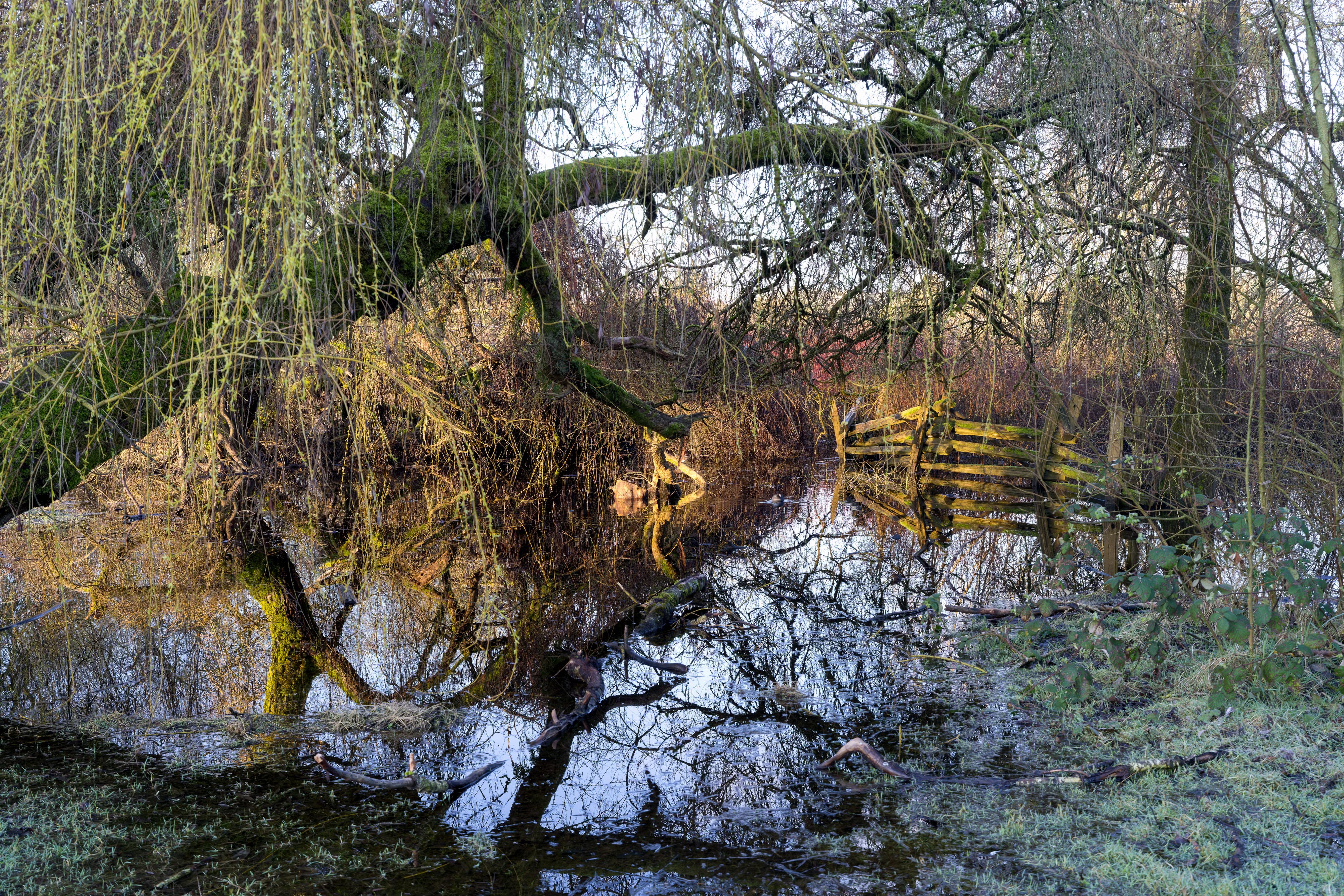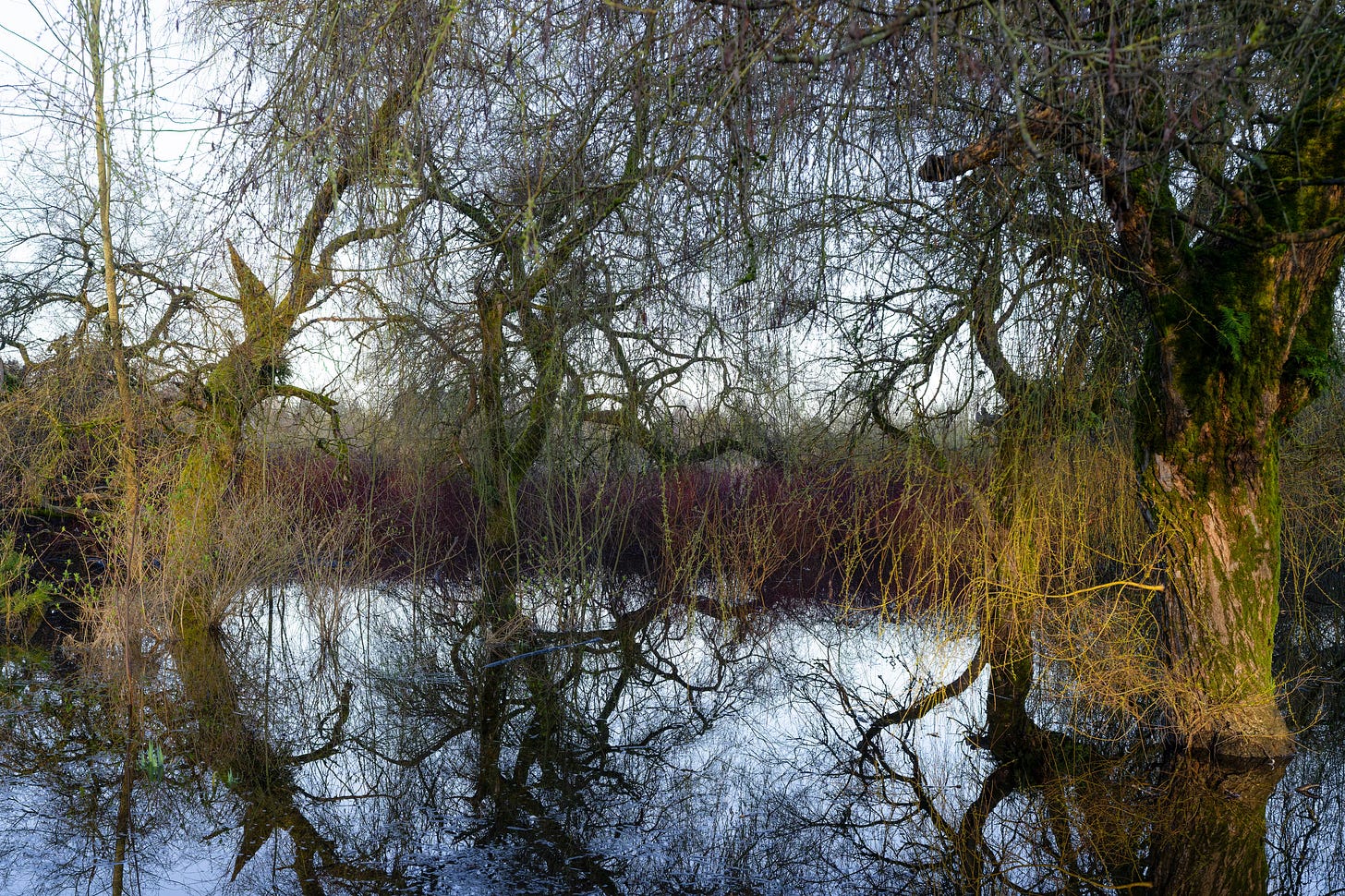 At the end of the pond, sometimes more of a bog, I came to a patch of flooded ground where several willows bent low over the water. Water was covered with the thinnest layer of ice. As I walked past, something about the scene caught my attention. A trunk curved across the view. Thin branches hung down into the water. Their reflections appeared beneath them. A strip of moss along the bank was catching. light breaking through a long, tiny slit in the cloud cover. It wasn’t anything dramatic, but the pieces lined up just for a moment.