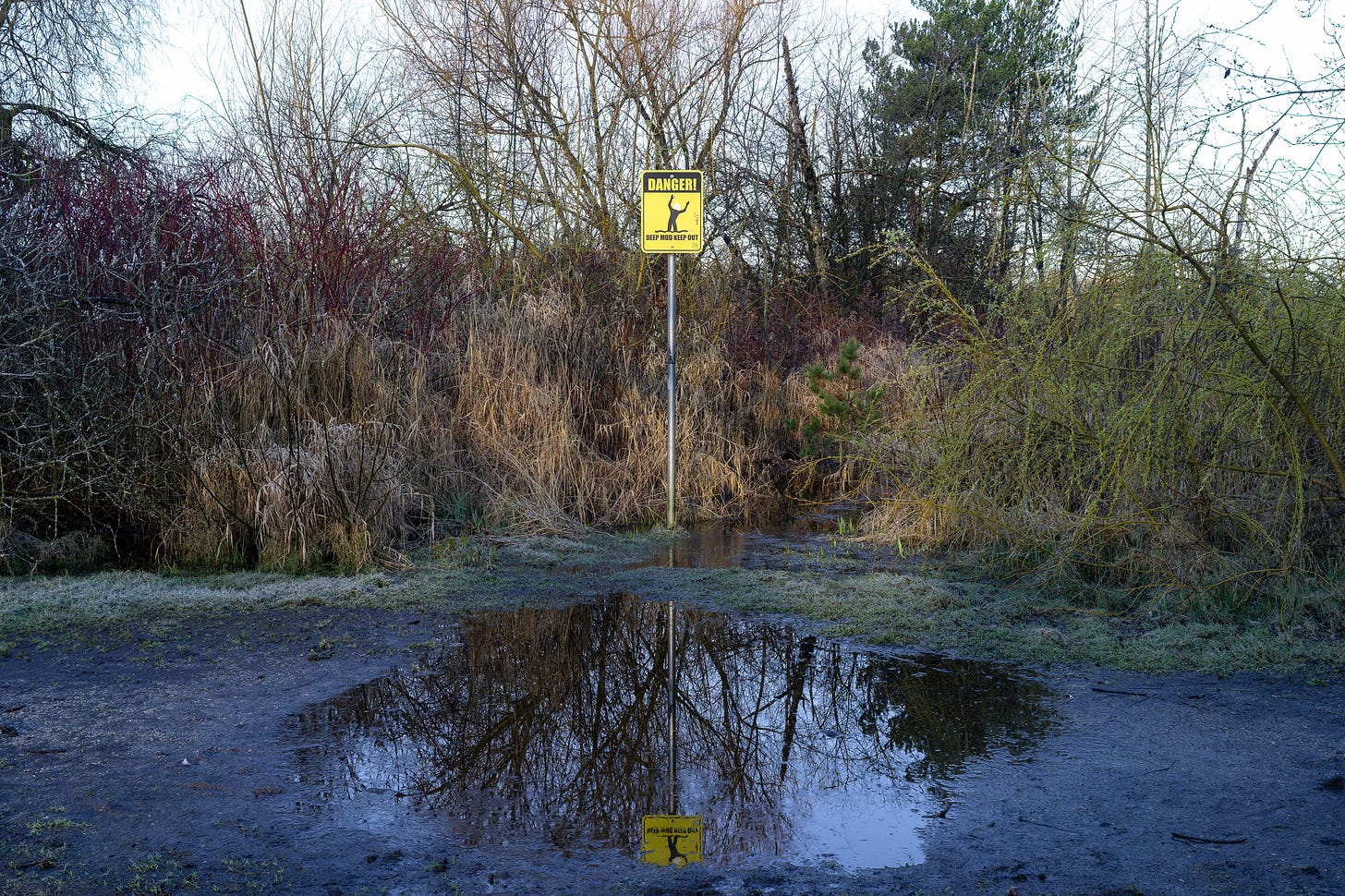 I noticed something else. The place looks slightly strange in the photographs, even though there is nothing strange about it. It is just wet ground in a park, with a few willows growing along the edge of a muddy pond. For a few minutes that morning, the branches, the water, and the light happened to fall together in a way that looks arranged, almost composed. It reminded me a little of a museum diorama, except this one was empty. Everything comes together inside the little rectangle, within the constructed box. And everything is so still. I remembered how walking down the path had cleared out the scene. Emptied it of activity.